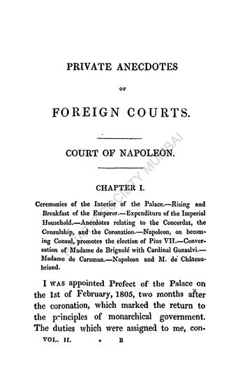 Private anecdotes of foreign courts.... to which are subjoined memories extracted from the portefeuille of baron de m-with anecdotes of the french court by the perfect of the imperial palace in 2vol