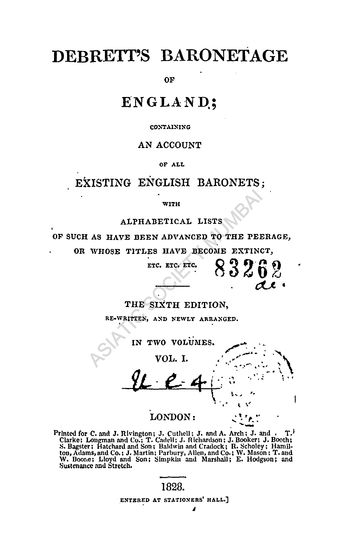 Baronetage Of England ;Containing An Account Of All Existing English Baronets In 2 Vols.(Vol.I)