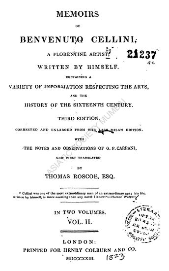 | Author | : | Cellini, Benvenuto Roscoe Thomas(Tr. By) |