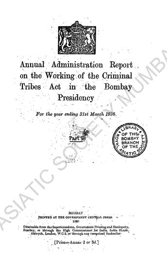 Report on the Working of the Criminal Tribes Act in the Bombay Presidency Part-I,For the Year Ending March 31St,1936