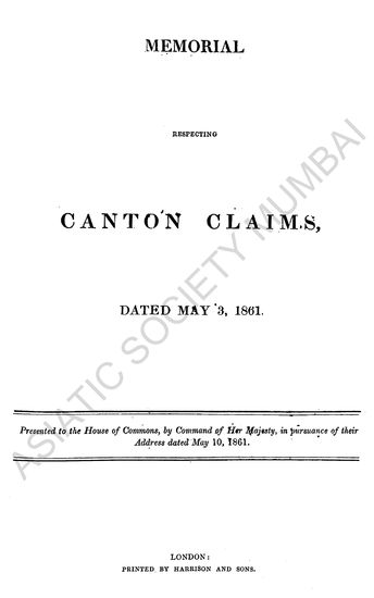 Memorial respecting Canton Claims, Dated May 3, 1861