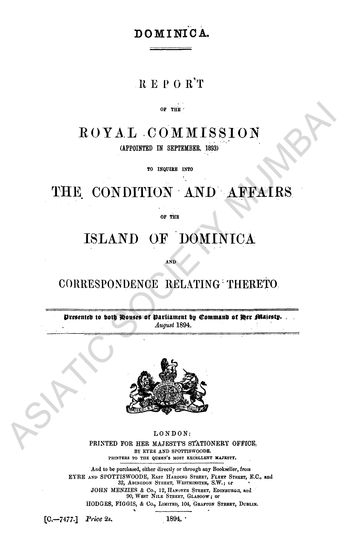 Report of the Royal Commission (apointed in September 1893) to inquire into the Condition and Affairs of the Island of Dominica and Correspondence relating thereto