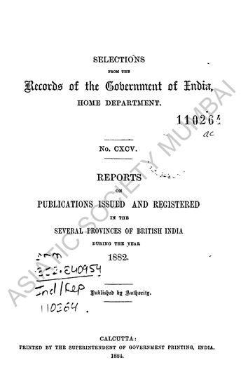 Reports on Publications issued and Registered in the Several Provinces of British India, during the Year 1882 (Selections from the Records of the Government of India, Home Department, No. CXCV.)