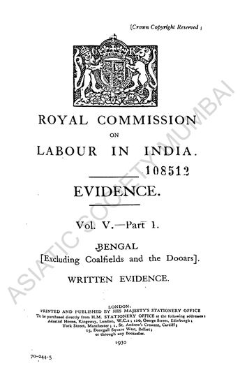 Evidence, Vol. V.- Part I. Bengal (excluding Coalfields and the Dooars), Written Evidence