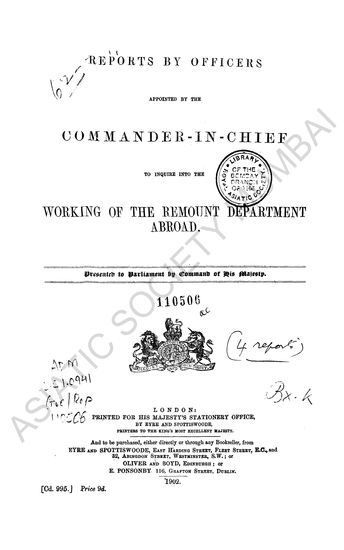 Reports by Officers appointed by the Commander-in-Chief to Inquire into the Working of the Remount Department Abroad.