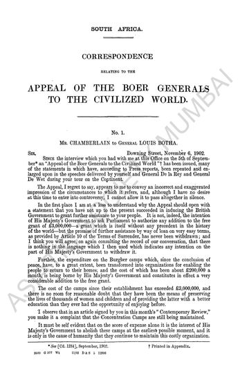 Correspondence relating to the Appeal of the Boer Generals to the Civilized World