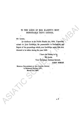Public Health Sixth Report of the Medical Officer of the Privy Council, 1863