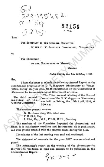 Report on the Condition and Progress of G. V. Juggarow Observatory, Vizagapatnam, 1897