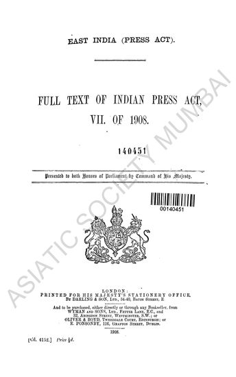 Full Text of Indian Press Act, VII. of 1908 (East India (Press Act))