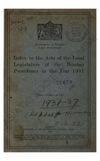 Index to the Acts of the Local Legislature of the Bombay Presidency in the year 1931-1937 (bounded together)