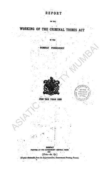 Report on the Working of the Criminal Tribes Act in the Bombay Presidency (Including Sind) for the Year 1920