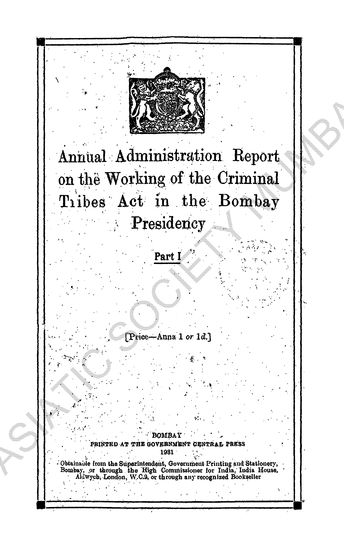 Report on the Working of the Criminal Tribes Act in the Bombay Presidency Part-I,For the Year Ending March 31St,1931