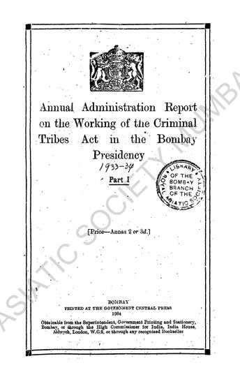 Report on the Working of the Criminal Tribes Act in the Bombay Presidency Part-I,For the Year Ending March 31St,1934