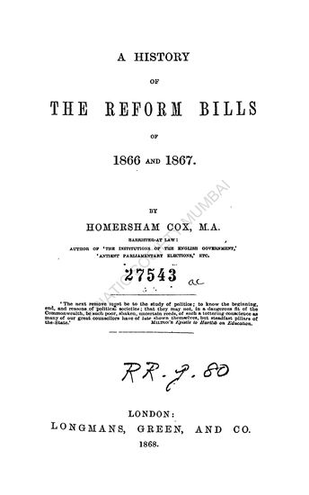 Reform Bill, 1866: Epitome of the Debate on the Motion of the Rt. Hon. W. E. Gladstone for leave to bring in a Bill to extend the Franchise in England and Wales, 12th and 13th March, 1866