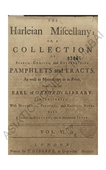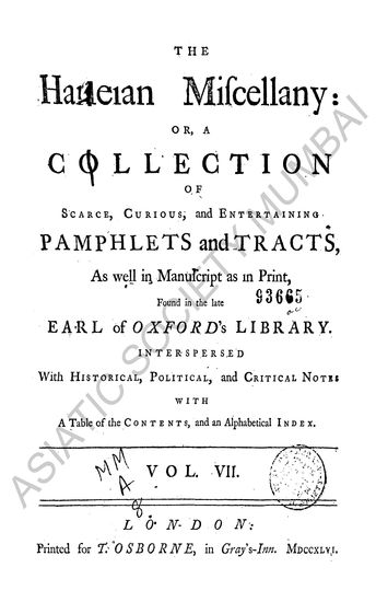 The Harleian Miscellany; or, a Collection of Scarce, Curious and Entertaining Pamphlets and Tracts, as well in Manuscript as in Print, found in the late Earl of Oxford's Library, interspersed, with Historical, Political and Critical Notes, with a Table of the Contents, and an Alphabetical Index, Vol. I