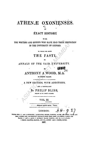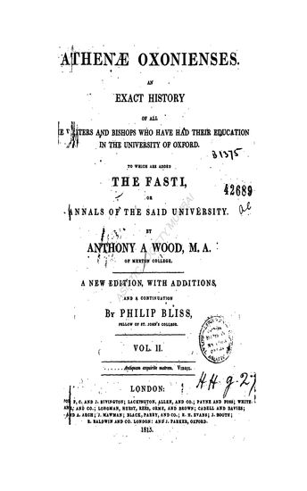 | Author | : | Wood, Anthony A. Bliss, Philip (Ed.) |