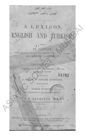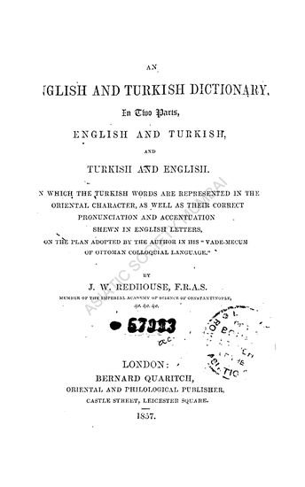 A Lexicon, English and Turkish; shewing, in Turkish, the Literal, Incidental, Figurative, Colloquial and Technical Significations of the English Terms indicating their Pronounciation in a New and Systematic Manner and preceded by a Sketch of English Etymology to facilitate to Turkish Students the acquisition of the English Language, 3rd ed.