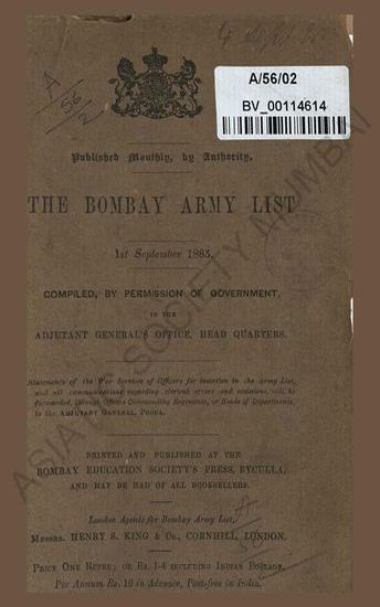 Bombay Army List 1st September 1885, compiled by permission of government, in the adjutant-general's office head quarters.