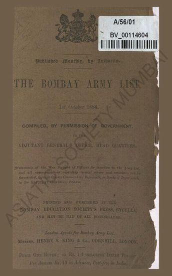 Bombay Army List 1st October 1894 corrected upto 30th September 1894, compiled by permission of government, in the adjutant-general's office head quarters.