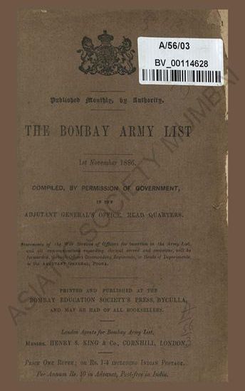 Bombay Army List 1st November 1886, compiled by permission of government, in the adjutant-general's office head quarters.
