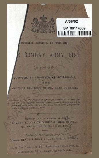 Bombay Army List 1st April 1885, compiled by permission of government, in the adjutant-general's office head quarters.