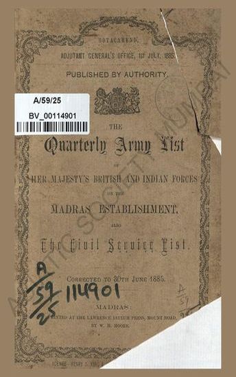Abridge Quarterly army list of Her Majesty's British and Indian forces on the Madras Establishment, corrected to 30th June,1889.