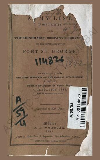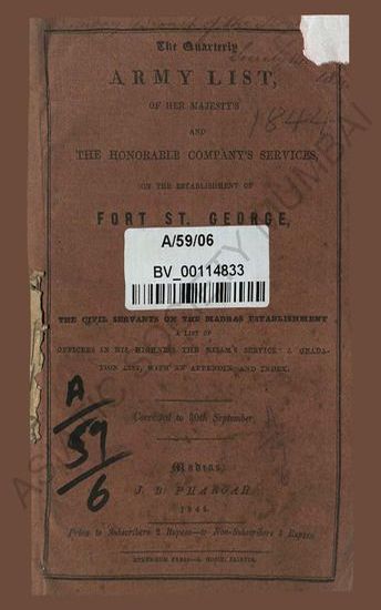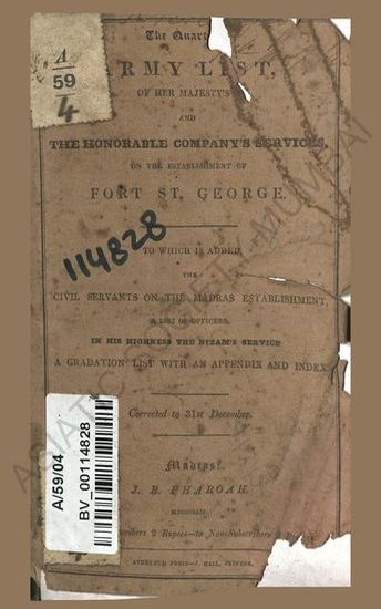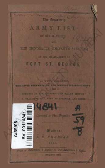 Quarterly army list of Her Majesty's and the honorable company's services, on the establishment of Fort St. George,to which is added, the civil servants on the Madras establishment, a list of officers in his H.H. The Nizam's service, a gradation list, with an appendix and index.