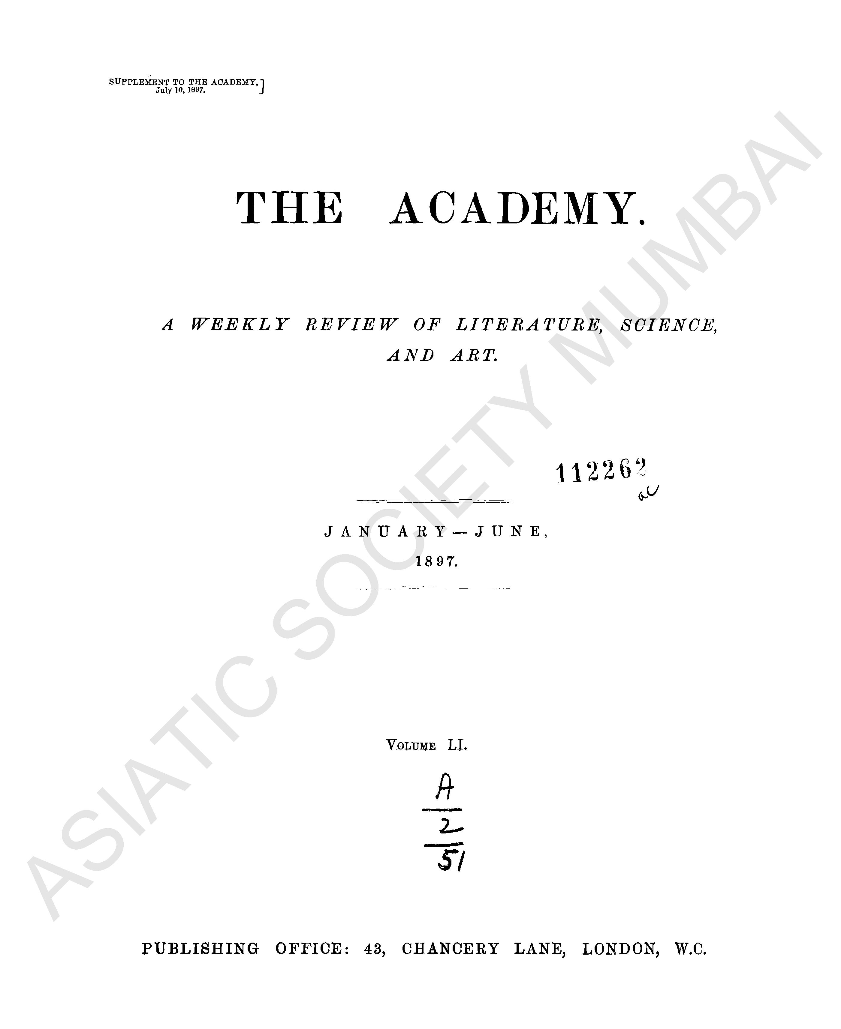 Academy a weekly review of Literature, Science and Art, January - June, 1897.