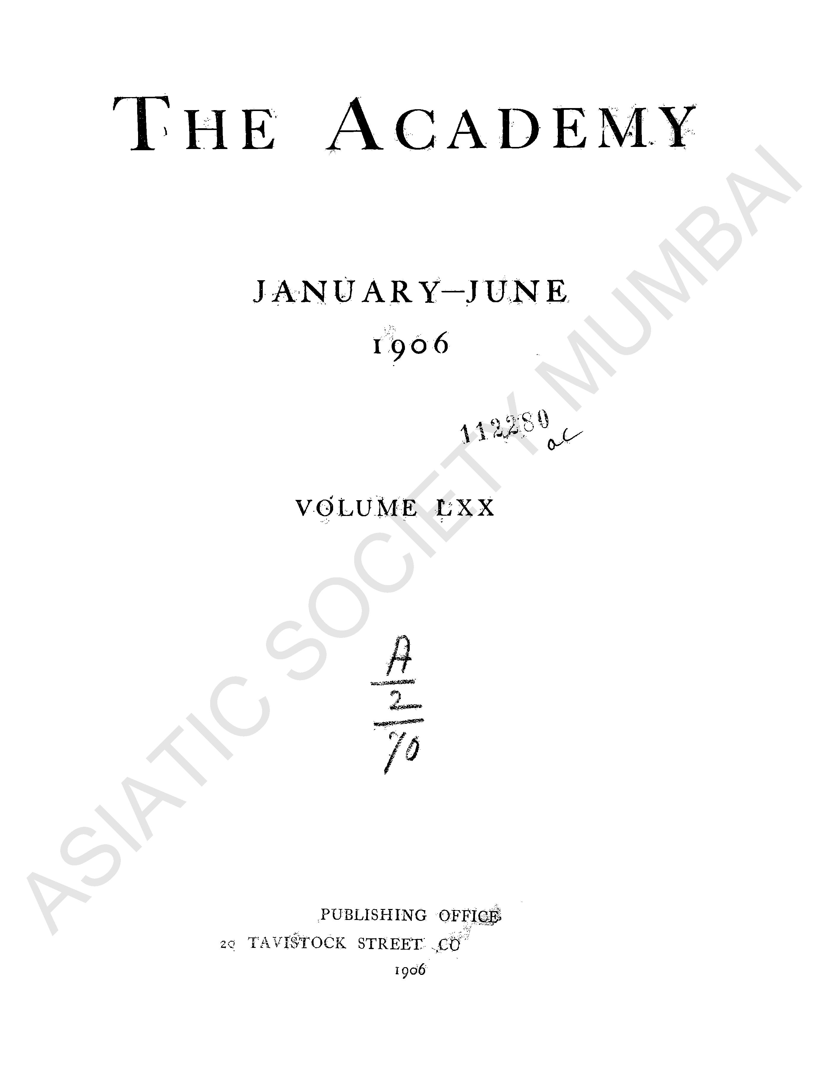 Academy, January - June, Vol. LXX, 1906.