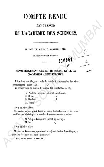 Comptes Rendus Hebdomadaires Des Seances De L'Academie Des Sciences Serie Monday 5 January 1846.