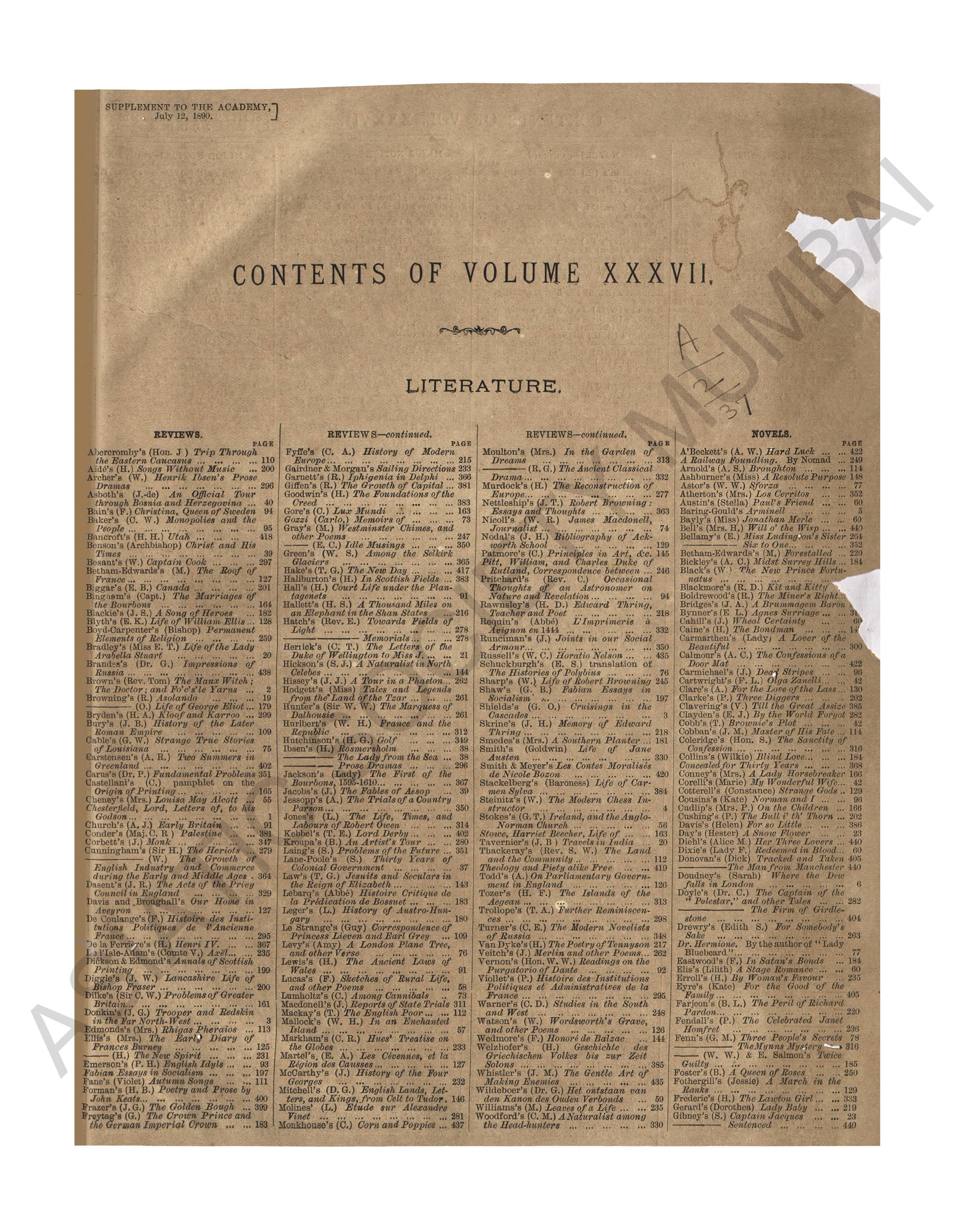 Academy a weekly review of Literature, Science and Arts, January - June, Vol. XXXV, 1889.