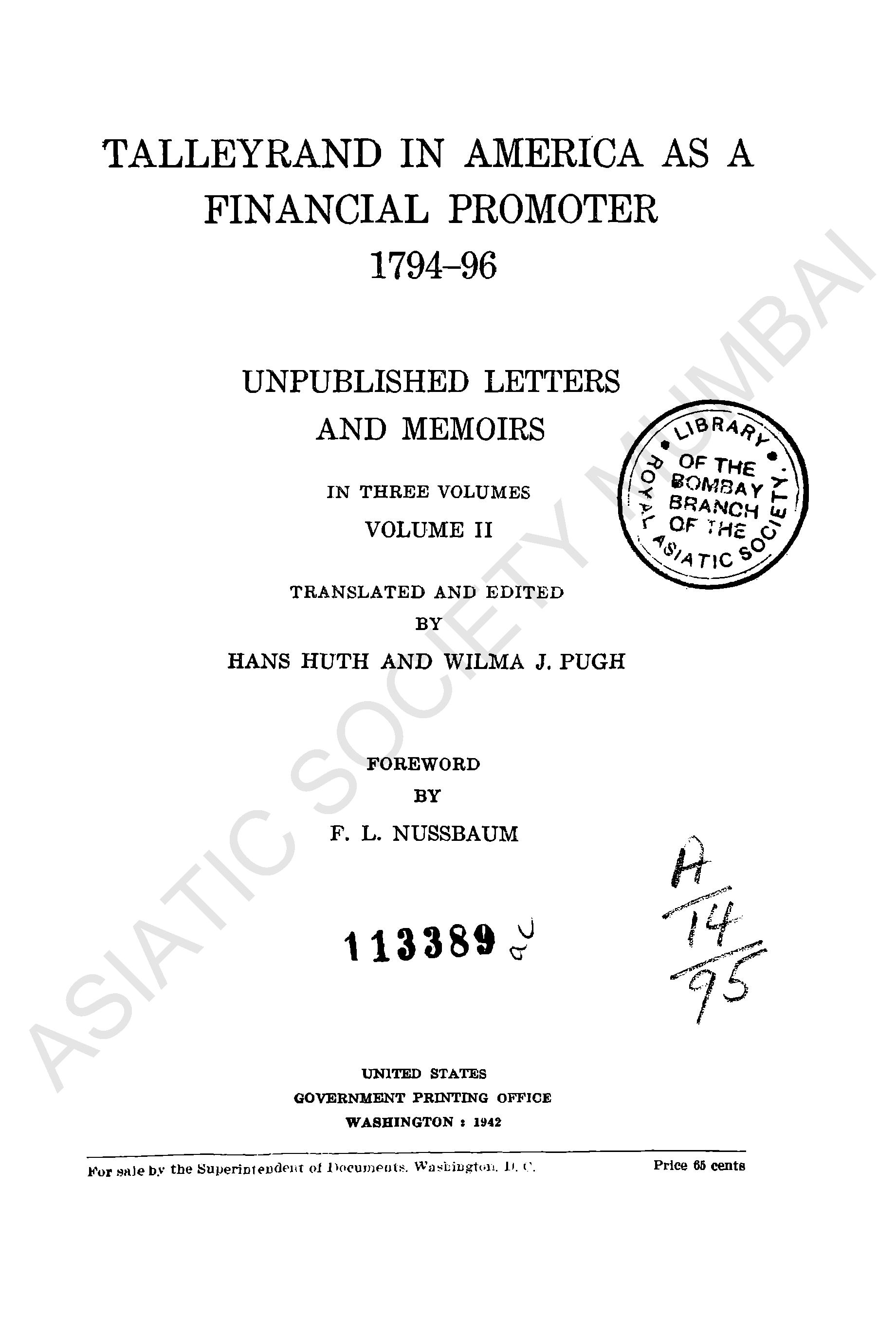 Talleyrand in America as a Financial Promoter 1794 - 96 unpublished letters and memoirs, Vol II.