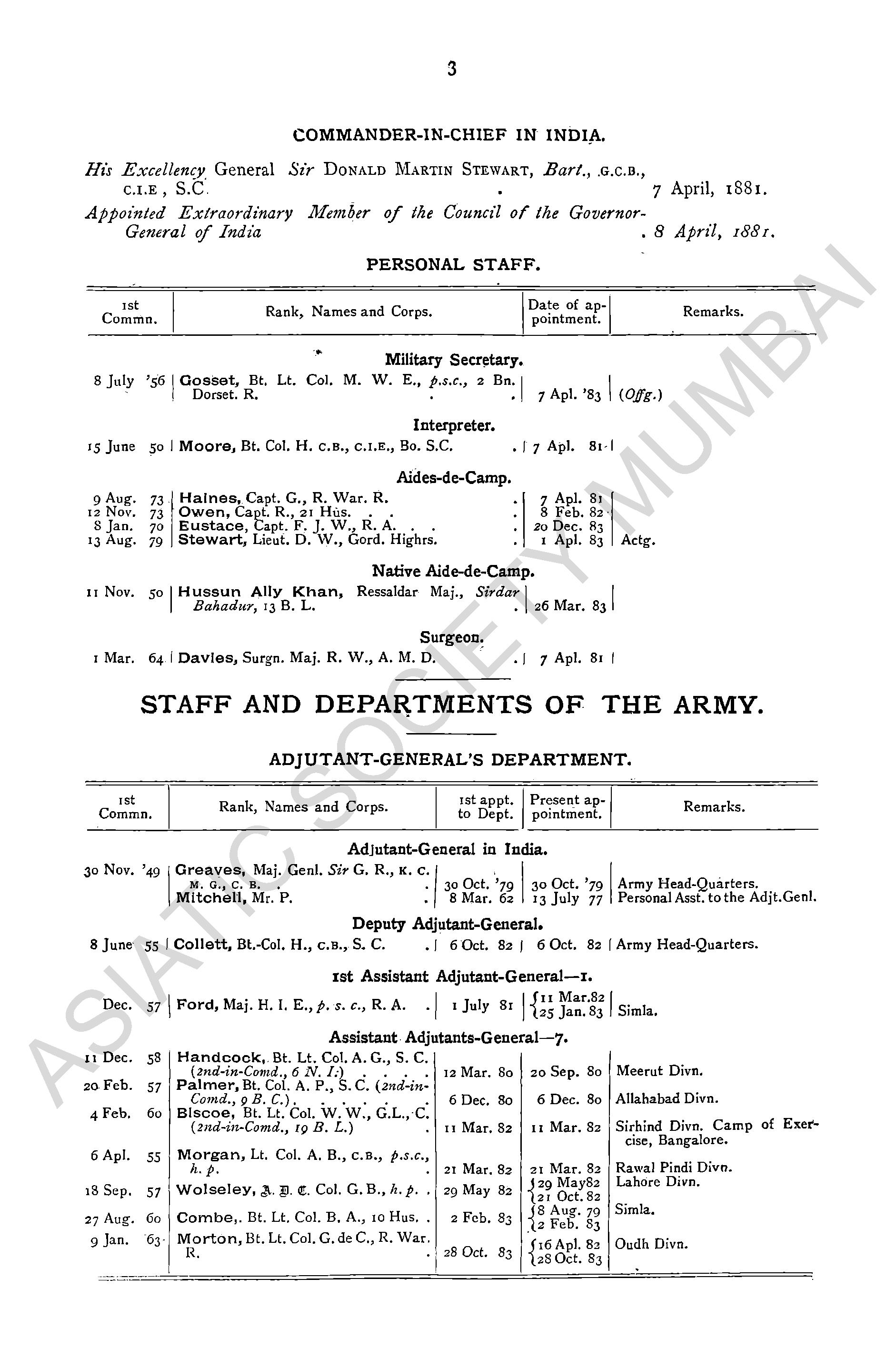 Bombay Army List 1st November 1892 corrected upto 31st October 1892, compiled by permission of government, in the adjutant-general's office head quarters.