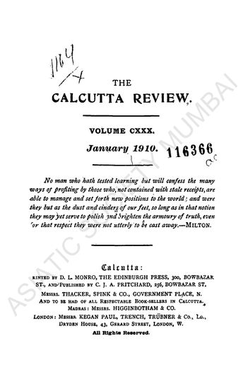 Calcutta Review, Vol. CXXX, January 1910.