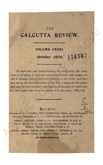 Calcutta Review, Vol. CXXXI, October 1910.