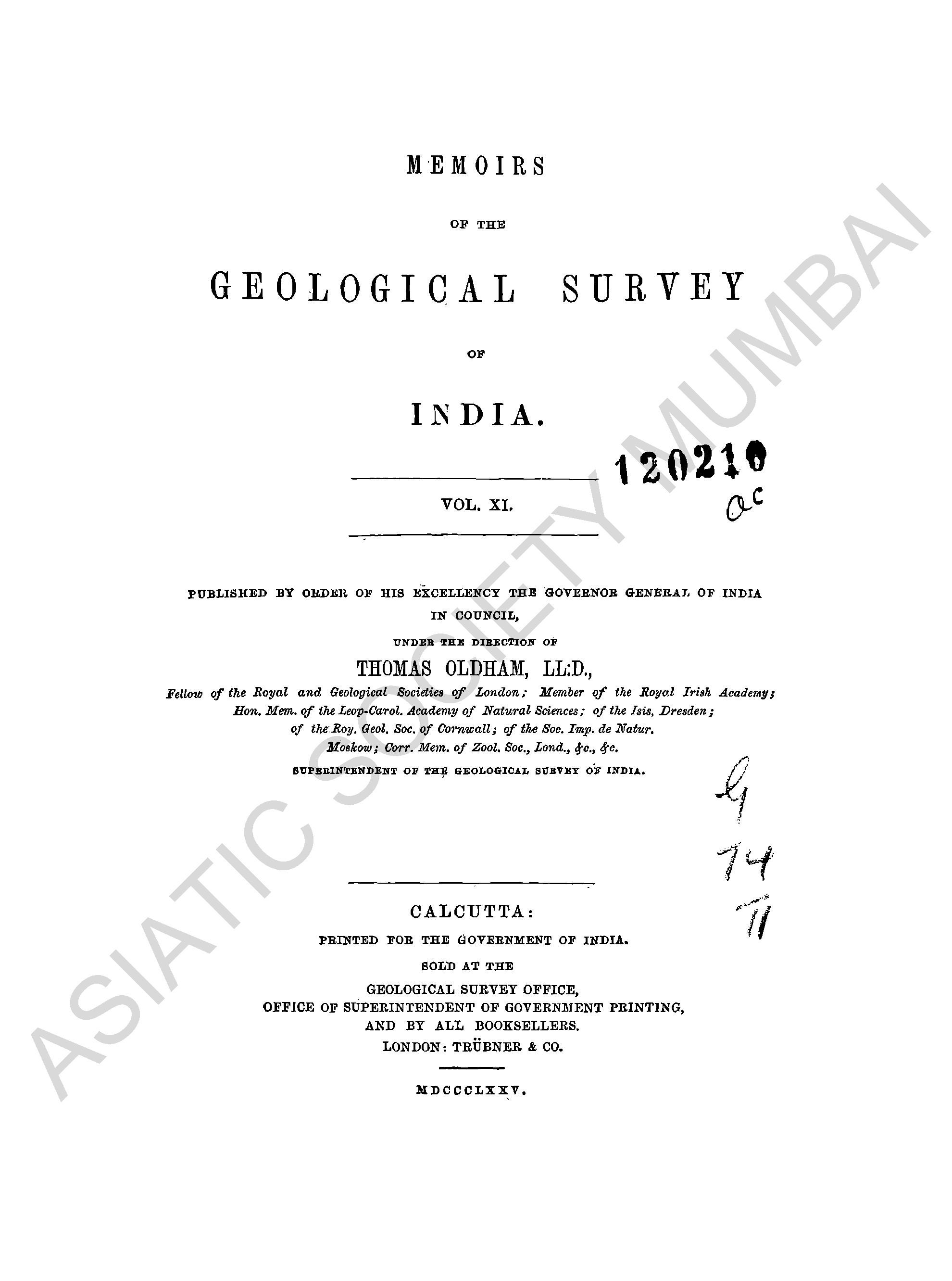 Memoirs of the Geological Survey of India, Vol. XI.