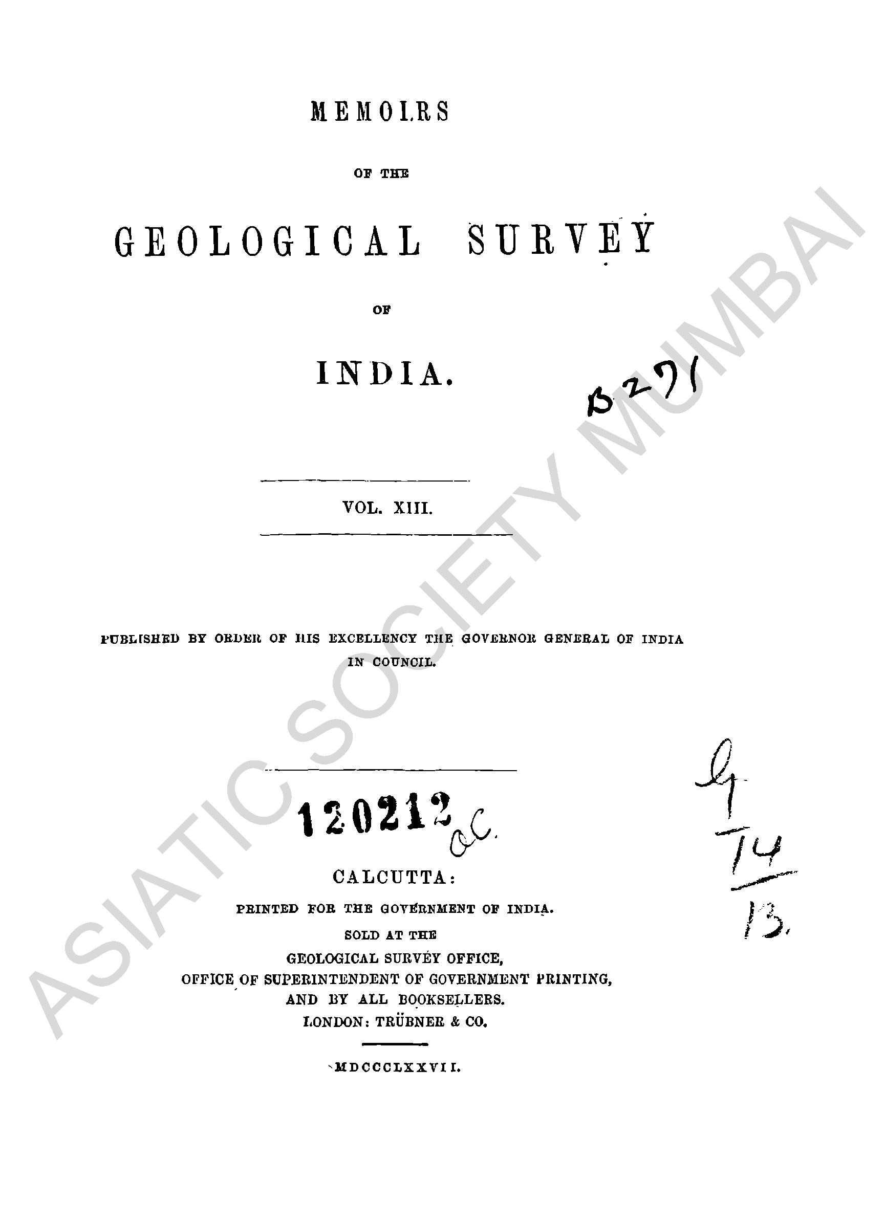 Memoirs of the Geological Survey of India, Vol. XIII.