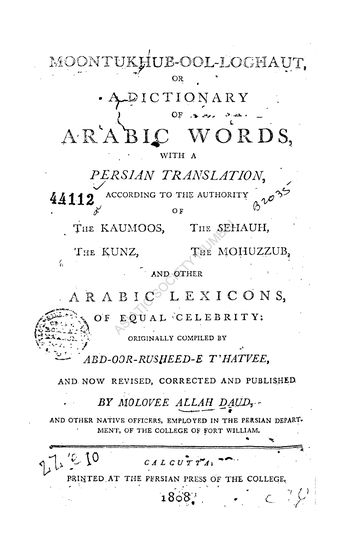 An Arabic-English Lexicon, derived from the most copious eastern sources; comprising a very large collection if words and significations omitted in the Kamoos, with supplements to its abdridged and defective explanations, ample Grammatical and critical comments and examples in prose and Verse; composed by means of the munificence of the most noble Algernon, Duke of Northumberland and the bounty of the British Government, in Two Books: the First containing all the Classical Words and significations commonly known to the learned among the Arabs; the Second, those that are of rare occurrence and not commonly known, Book I. - Part I.