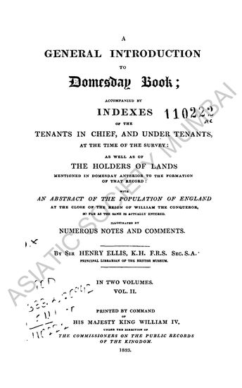 A General Introduction to Domesday book, accompanied by Indexes of the Tenants in Chief and under Tenants at the time of the survey, as well as of the Holders of Lands, mentioned in domesday anterior to the formation of that record, with an Abstract of the Population of England at the close of the reign of William the Conqueror, so far as the same is actually entered illustrated by Numerous Notes and Comments, in Two Volumes, Vol. I