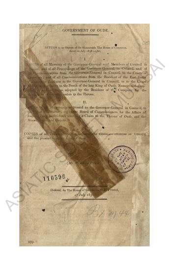Copies of Papers relative to the Restoration of the King of Tanjore, the Arrest of the Right Hon. George Lord Pigot, and the Removal of his Lordship from the Government of Fort St. George by sundry Members of the Council, Vol. I- containing Orders of the Court of Directors and Minutes of Council entered on Consultations; Vol. II- containing Letters from different Persons respecting the above Transactions