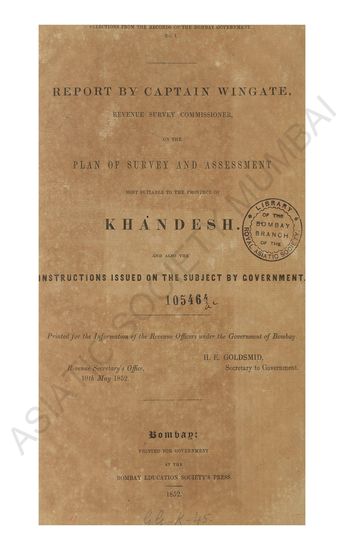 Report by Captain Wingate on the Plan of Survey and Assessment most suitable to the province of Khandesh and also the Instructions issued on the subject by Government (Selection from the Records of the Bombay Government, No. I)