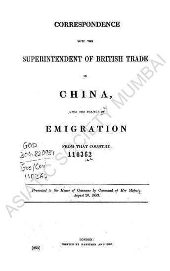 China; Correspondence with the Superintendent of British Trade in China upon the Subject of Emigration from the Country