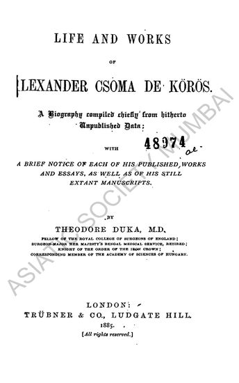 Life and Works of Alexander Csoma de Koros, a Biography ...